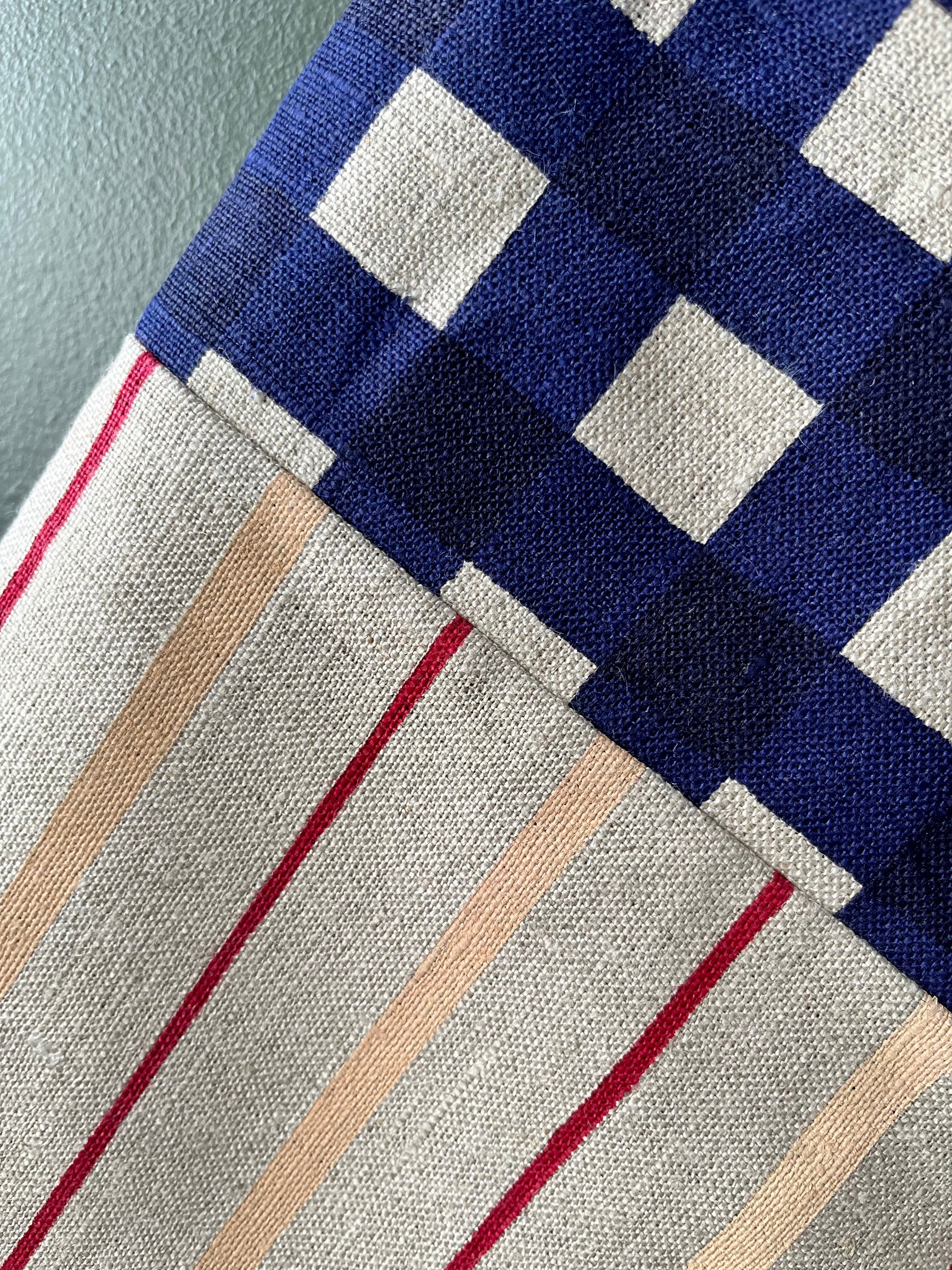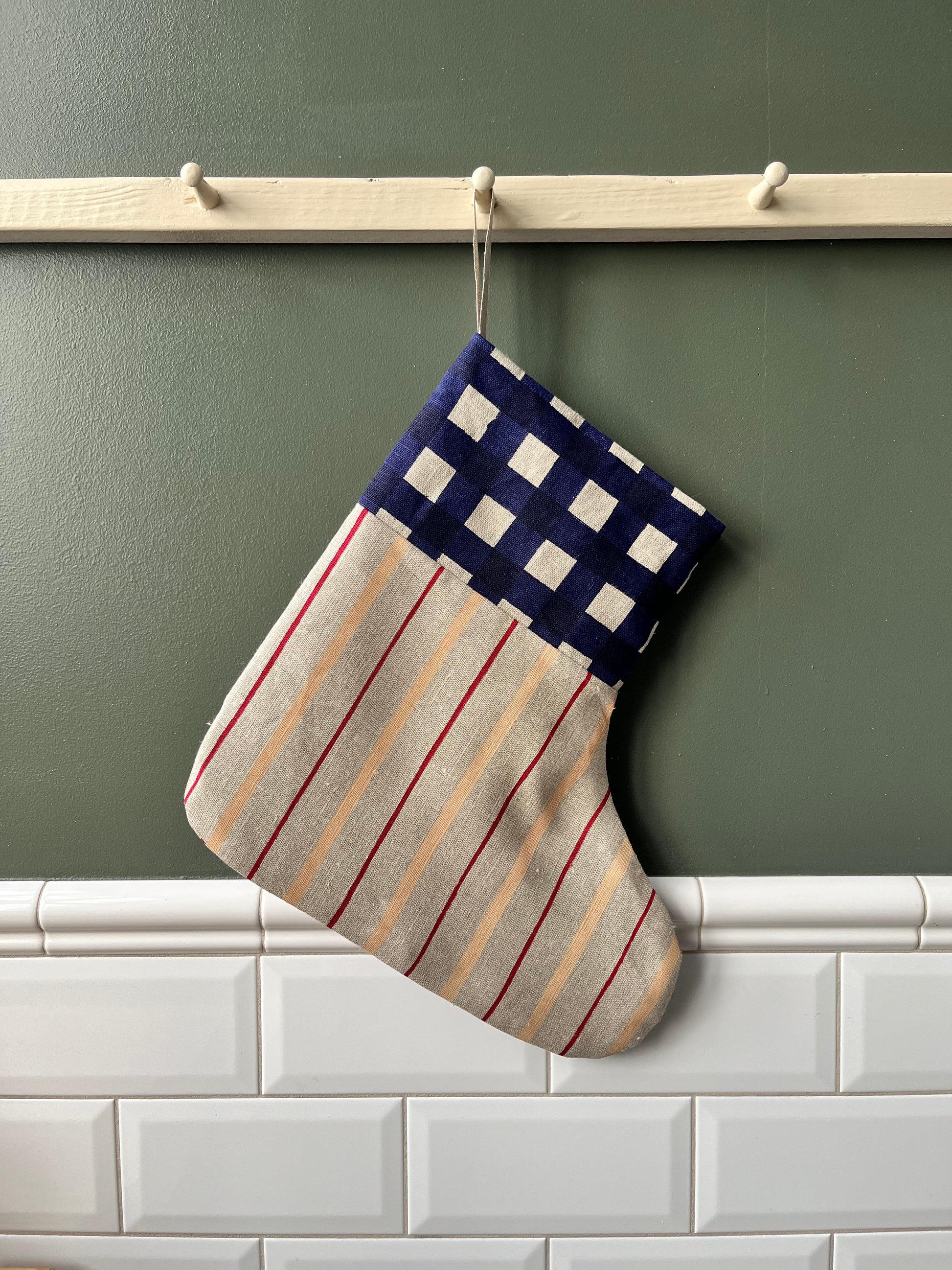 Julstrumpa sydd i europeiskt lintyg. Mönstret är handtryckt och strumpan finns endast i ett exemplar. Strumpan är fodrad i samma linkvalitet som utsidan, hänge av vävt linband. Ungefärligt mått: 35x37cm.