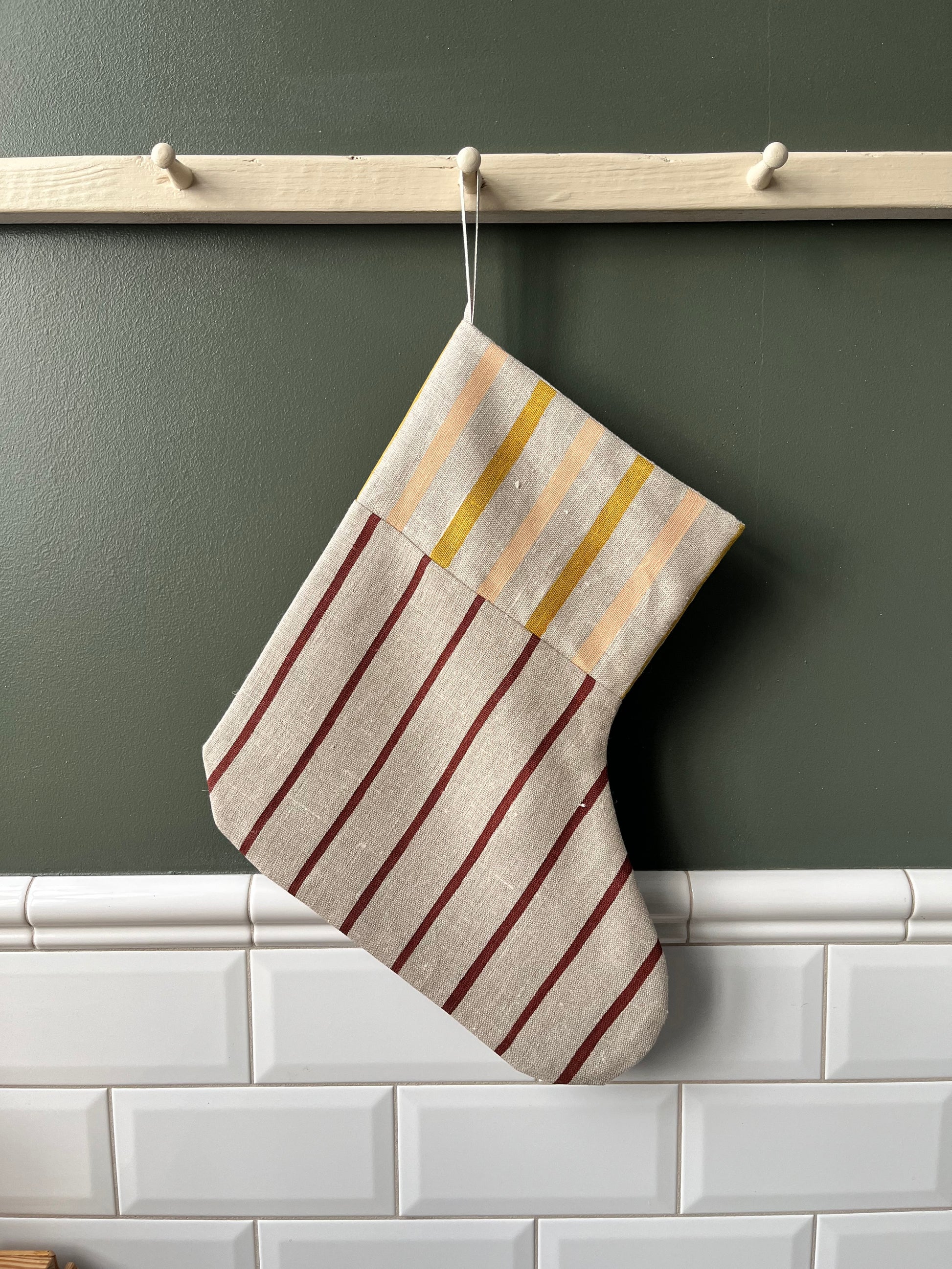 Julstrumpa sydd i europeiskt lintyg. Mönstret är handtryckt och strumpan finns endast i ett exemplar. Strumpan är fodrad i samma linkvalitet som utsidan, hänge av vävt linband. Ungefärligt mått: 35x37cm.