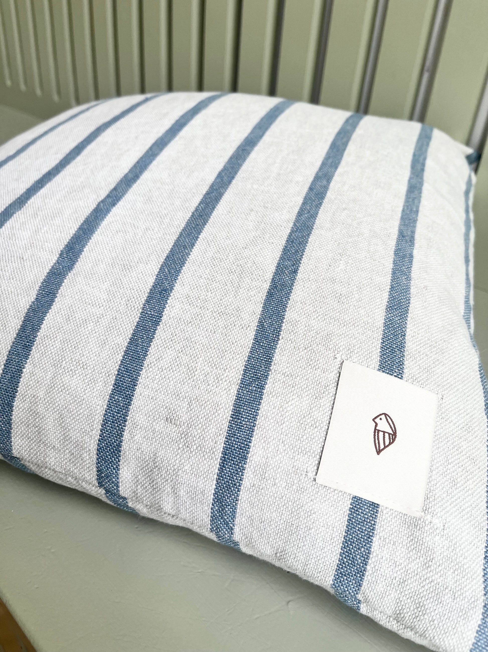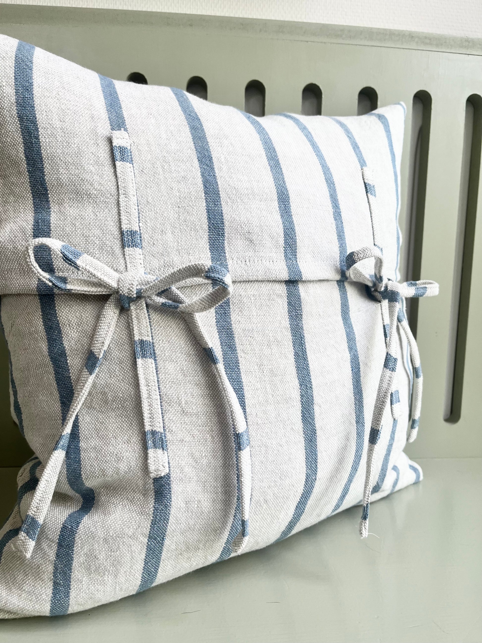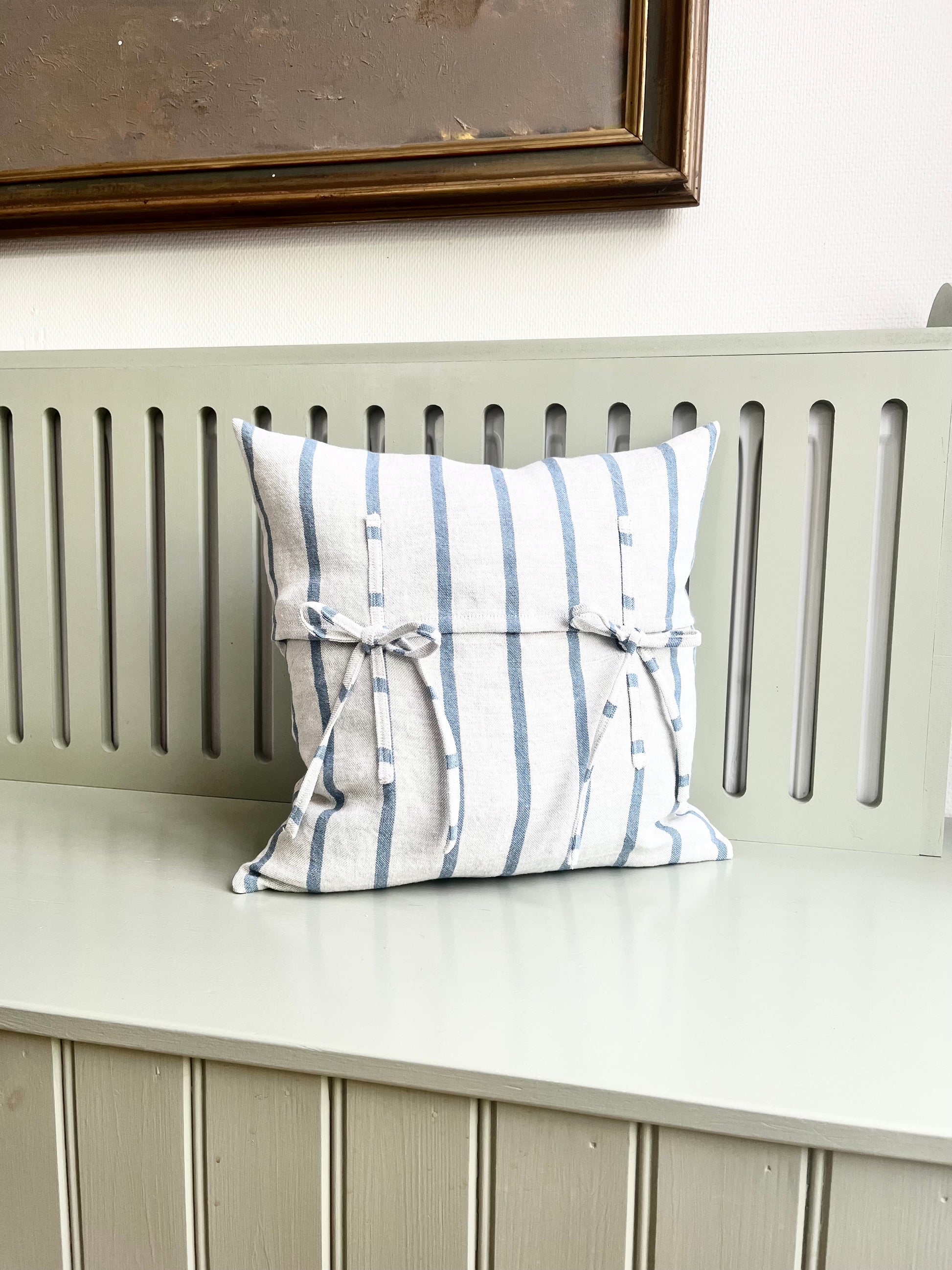 Kuddfodral av rustik kvalitet med linnefärgad botten och ljusblåa ränder. Mått 45x45 cm. Knyt fram och påsydd logga på baksidan. Sydd av återbrukat kvalitetstyg.