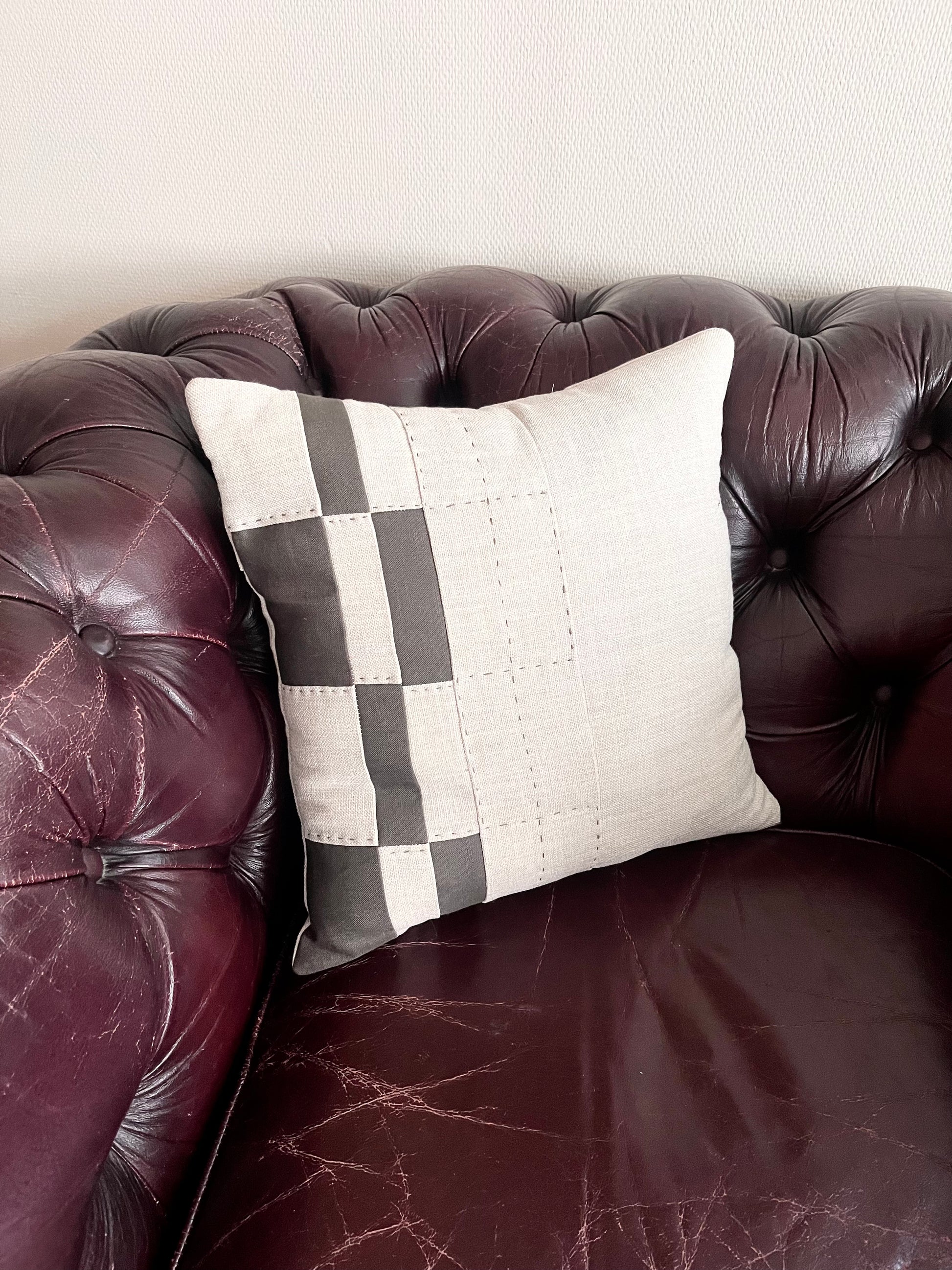 Kuddfodral sytt av endast återbrukad textil, mix av material. Lappteknik samt quiltad för hand. Beige och mörkgrå. Handtvätt. Endast kuddfodral ingår i priset. 45x45cm.
